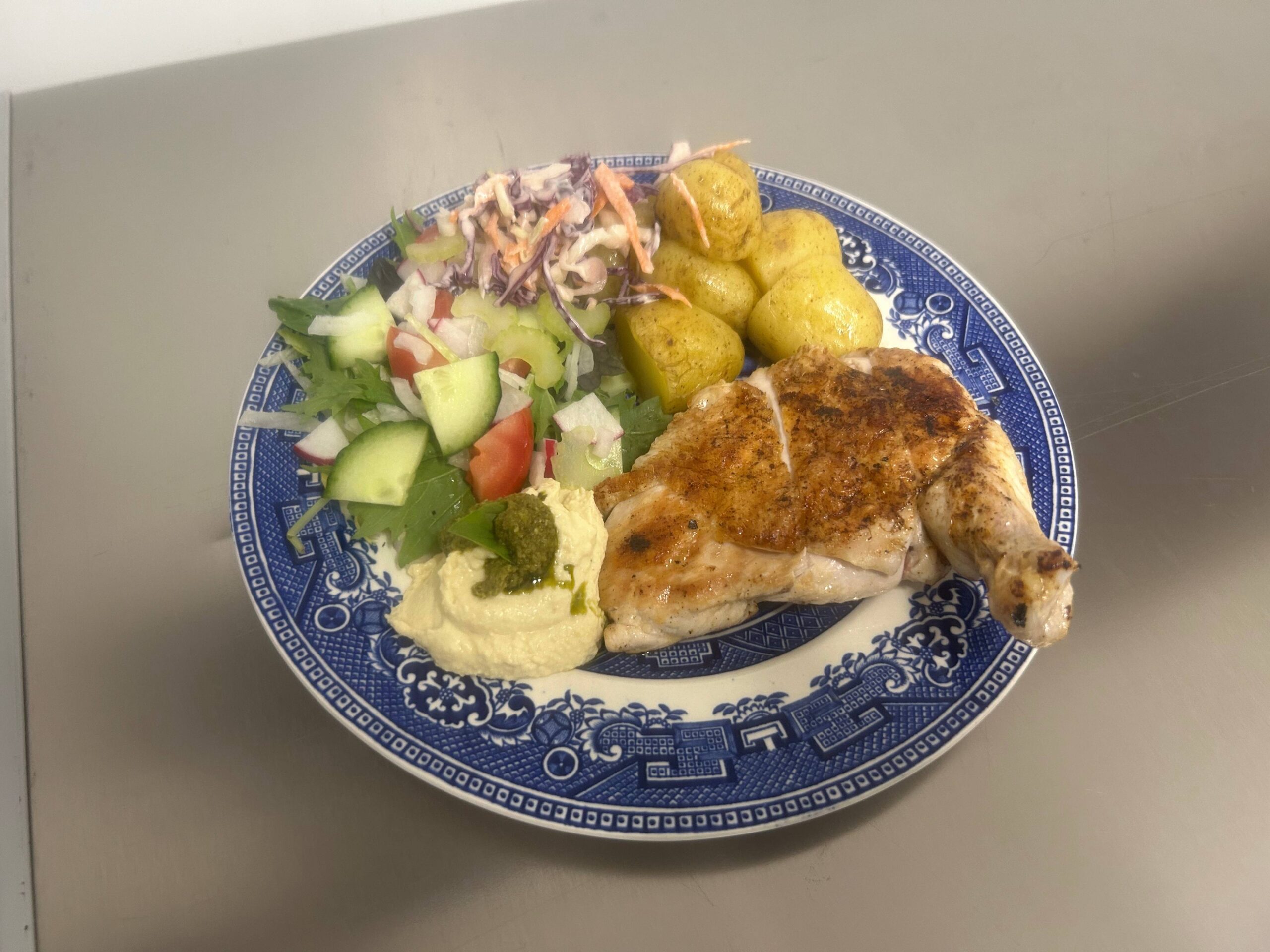 Served on a bed of crushed new potatoes, with salad and a chilli mango salsa